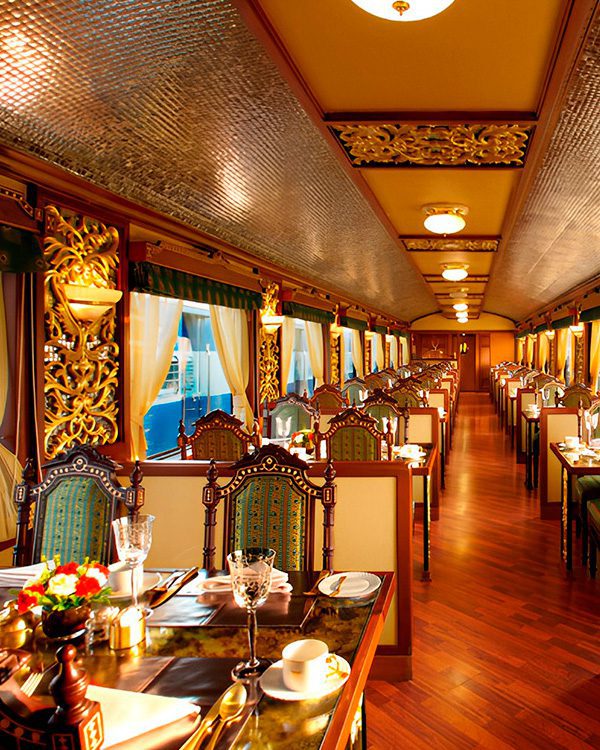 El Maharajas’ Express es el equivalente a un Taj Mahal en movimiento. Entre Udaipur, Jaipur y Agra, el tren combina exquisitez, cultura y colores vibrantes. Tiene suites con baño propio, bares-lounge y restaurantes que parecen joyas, llamados Rang Mahal y Mayur Mahal.